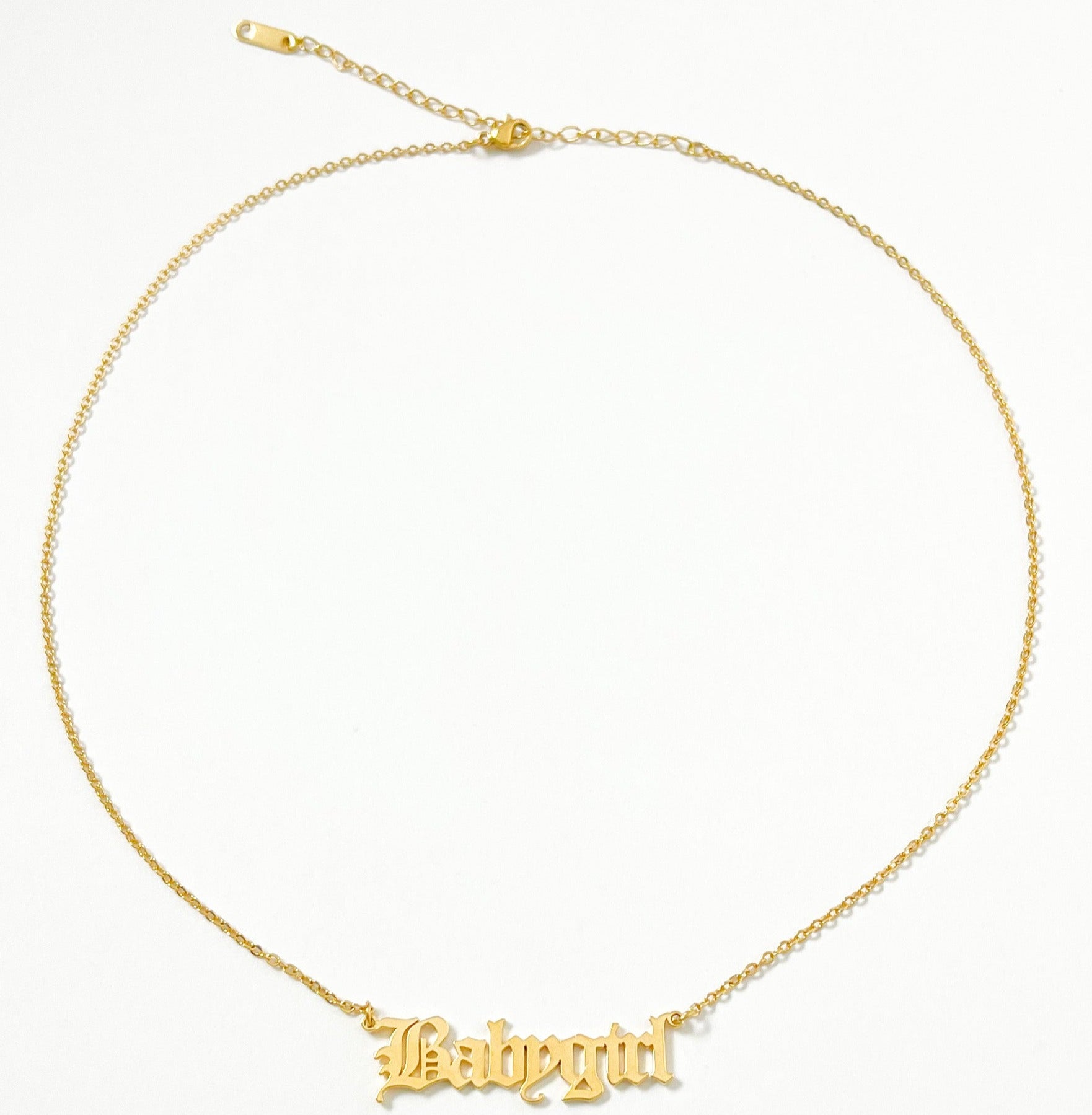 For the lovers of the old english style font. Our babygirl name necklace has been crafted from high quality stainless steel for a water and tarnish resistant finish so you can wear this necklace everyday. Choose from an 18k gold coating or stainless steel.