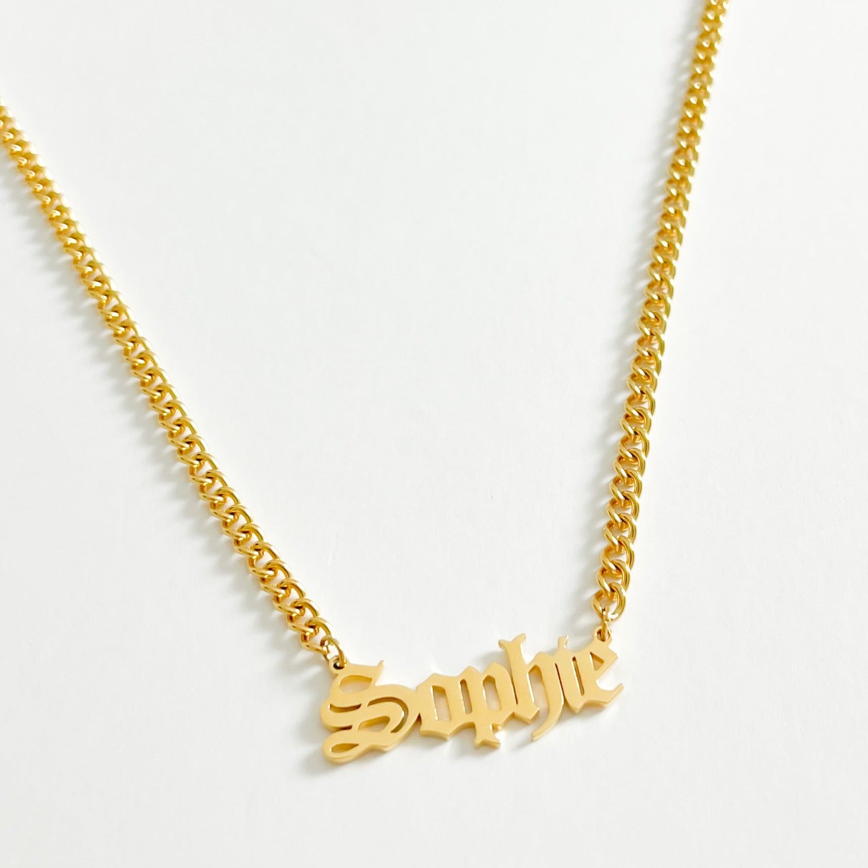 Getting deja vu? You can now get our classic old english font name necklace with a chunkier chain. Created for the lovers of a bold accessory - this old english name necklace feels more luxurious than ever. As always our old english name necklace has been crafted with high quality gold coated stainless steel for a durable, water proof and long lasting finish so you can wear this necklace everyday. Choose from an 18k gold coating, rose gold or stainless steel.