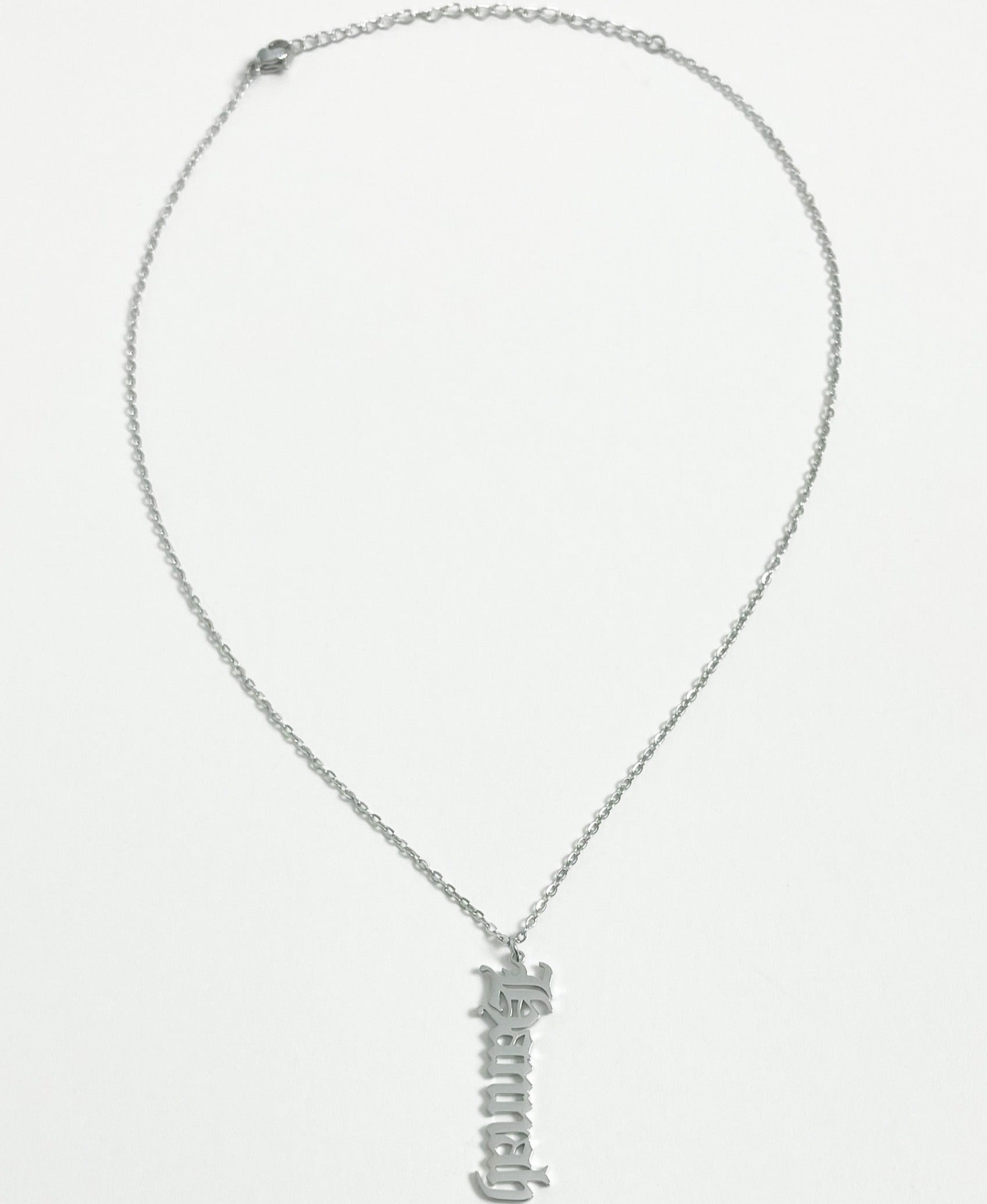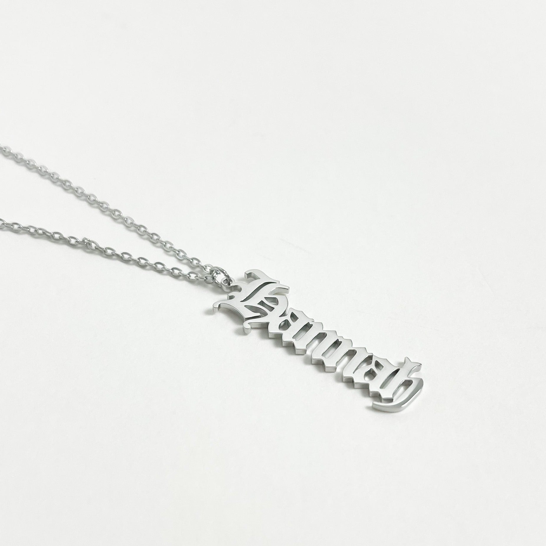 An old english custom name necklace with a twist. For the lovers of the old english style font - our silver vertical old english name necklace is the perfect unique custom piece.